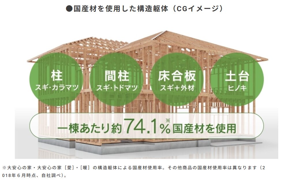 タマホームは、日本の気候に最適な「木造軸組在来工法」を採用しています。 驚くべきは、1棟あたりの国産材使用率が約74.1%と非常に高いこと。