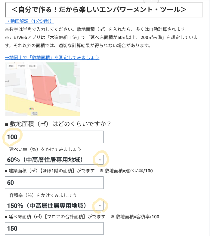 ここでは仮に100㎡を入力していますが、この数値(敷地面積)を入力するだけで、多くの部分は自動で計算されます。