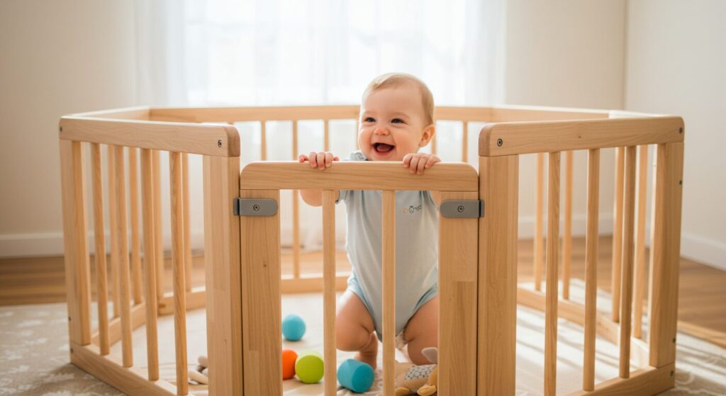 木製 | ・温かみがありインテリアになじみやすい ・柵の隙間から中の様子が見やすい ・安定感と耐久性がある | ・固いのでぶつかると痛い ・木のささくれに注意が必要 |