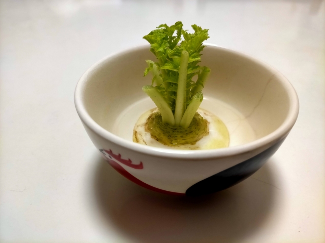 大根の上部を2〜3cmほど残してカットし、水を張った容器に入れるだけでOK。数日で小さな葉が出てきて、1週間ほどで青々とした葉に育ちます。
