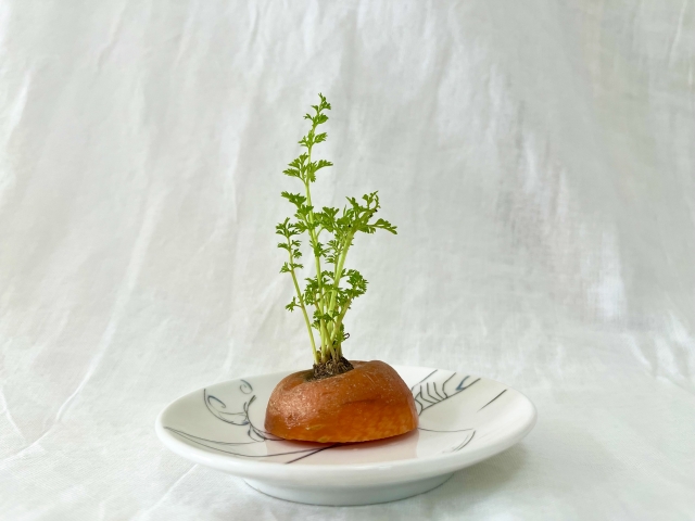 ニンジンのヘタ部分を1〜2cmほど残して水に浸けるだけで、かわいらしい葉が再生します。
