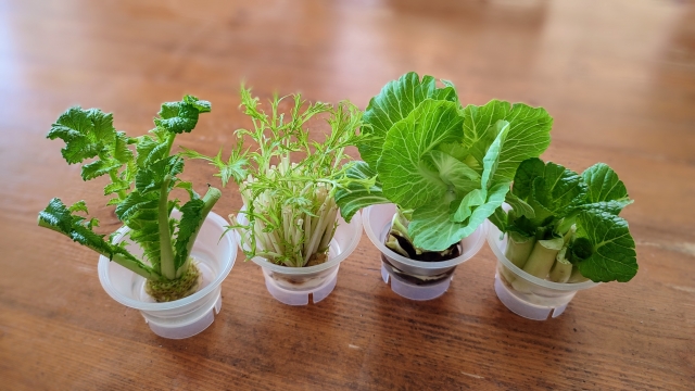 再生した葉は香りがよく、天ぷらや炒め物に使えます。育てる楽しさと飾る楽しさの両方を味わえる、リボベジの代表格です。