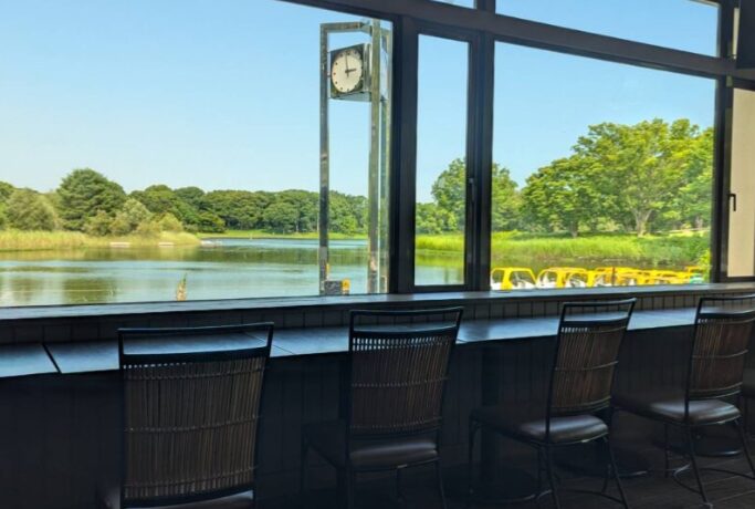 屋内にテーブル席があり、飲食の持ち込みも可能です。大きな窓からは池の景色を眺めながら、のんびり過ごせます。