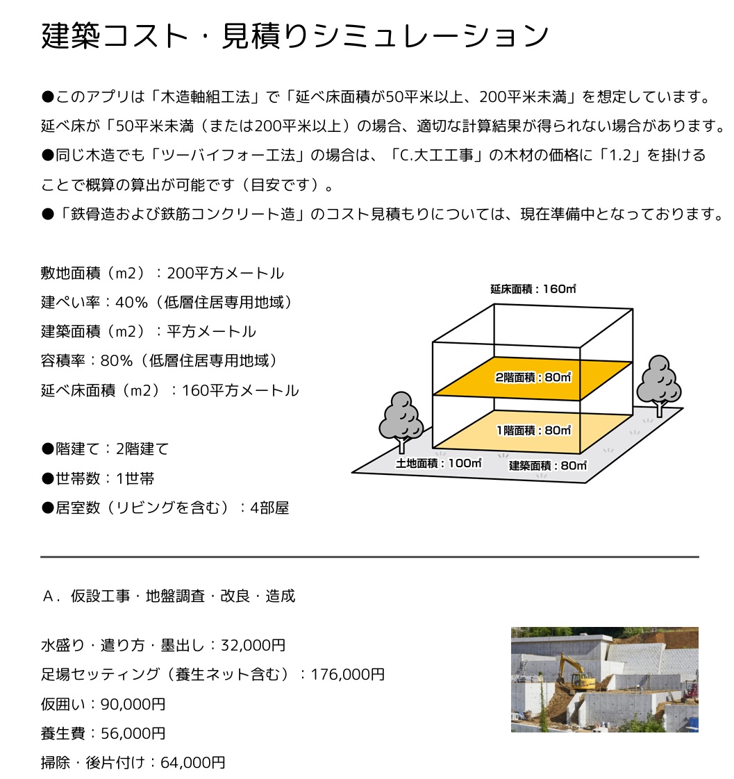 「敷地面積」を入力して「建築面積(ほぼ1階の面積」と「延べ床面積(フロアの合計床面積)」を調整して、いちばん下のところで「メールアドレス」を入れると「見積もり結果の詳細pdf」を入手できます。