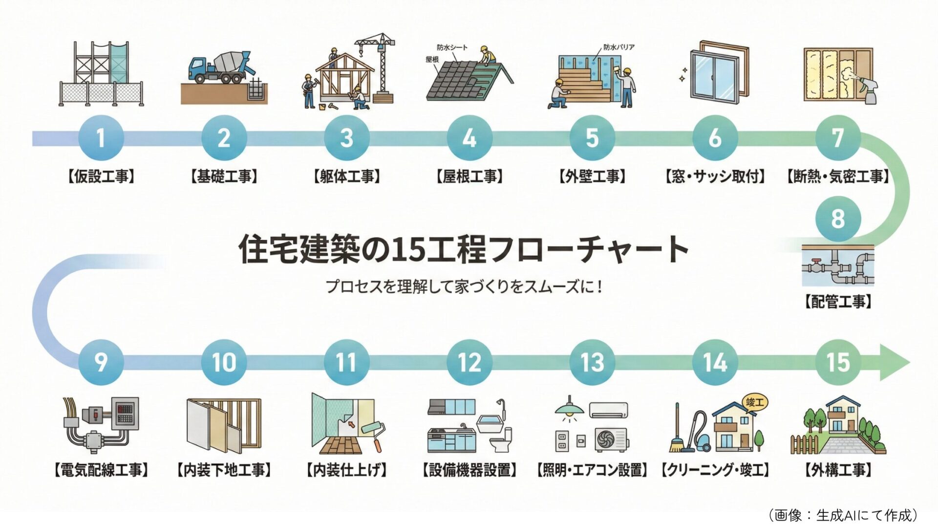 仮設・解体 → 基礎 → 木工事(大工) → 屋根・外壁 → 内装・設備 → 外構など