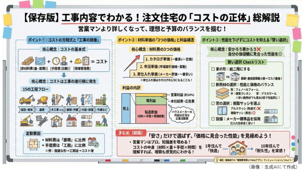 コストの中身(材料×量+手間×時間)を理解していれば、見積もりの増減も感覚的にわかるようになります。「この変更でなぜこれだけ高くなるのか?」と質問できるようになれば、納得のいく家づくりができます。