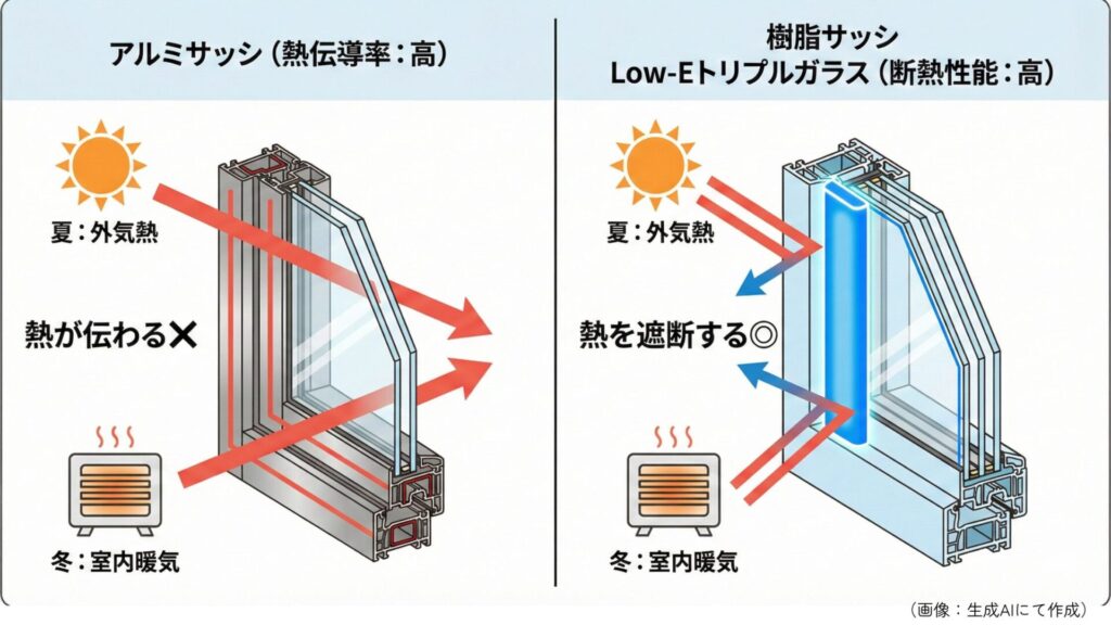 - 樹脂サッシ(または複合サッシ):初期費用は高いが、断熱性が高く冷暖房費を抑えられる