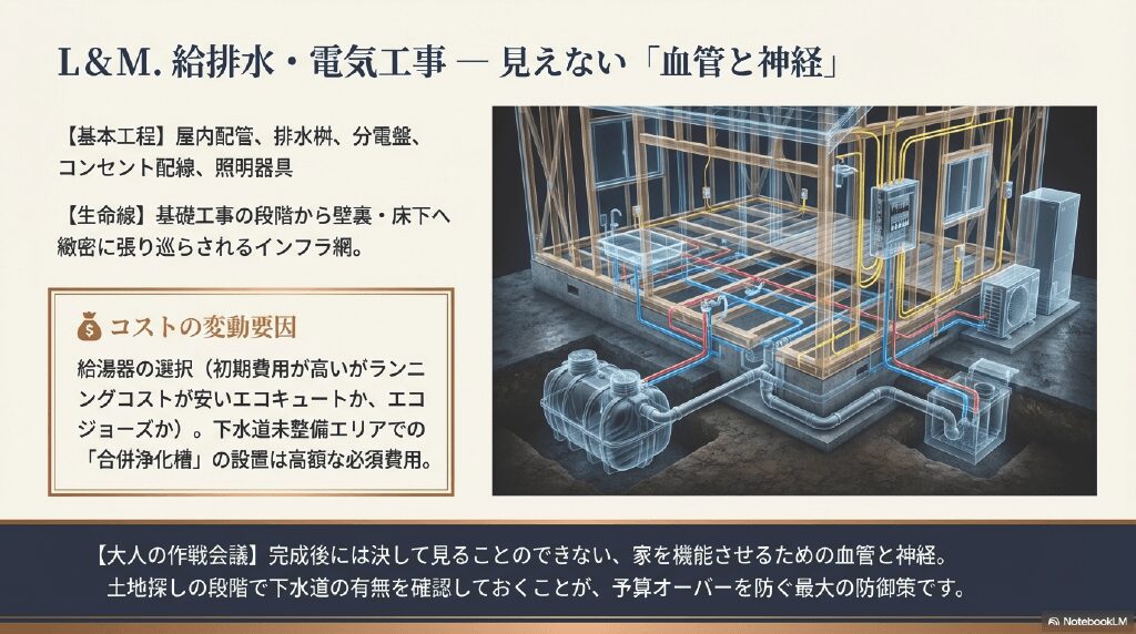 - 【大人の作戦会議】 完成後には決して見ることのできない、家を機能させるための血管と神経。土地探しの段階で下水道の有無を確認しておくことが、予算オーバーを防ぐ最大の防御策です。