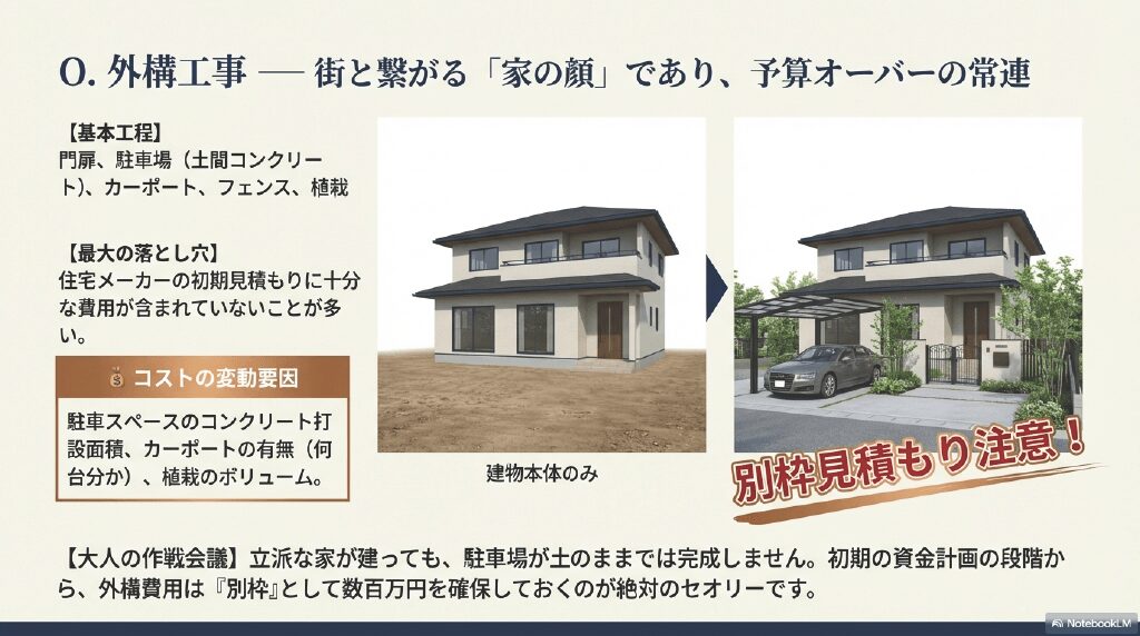 - 【大人の作戦会議】 立派な家が建っても、駐車場が土のままでは完成しません。初期の資金計画の段階から、外構費用は『別枠』として数百万円を確保しておくのが絶対のセオリーです。