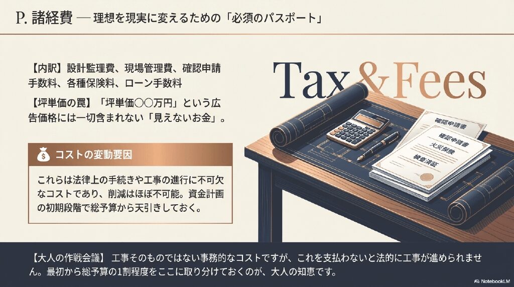 - 【大人の作戦会議】 工事そのものではない事務的なコストですが、これを支払わないと法的に工事が進められません。最初から総予算の1割程度をここに取り分けておくのが、大人の知恵です。