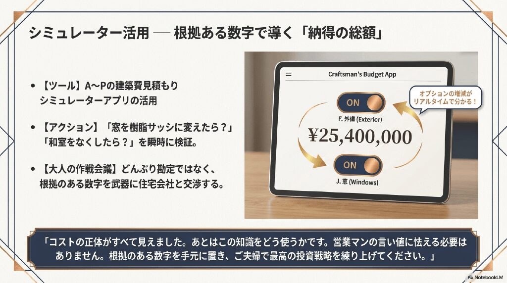 「コストの正体がすべて見えました。あとはこの知識をどう使うかです。営業マンの言い値に怯える必要はありません。根拠のある数字を手元に置き、ご夫婦で最高の投資戦略を練り上げてください。」