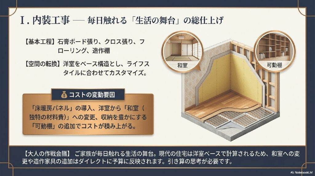 - 【コストの変動要因】 「床暖房パネル」の導入、洋室から「和室(独特の材料費)」への変更、収納を豊かにする「可動棚」の追加でコストが積み上がる。